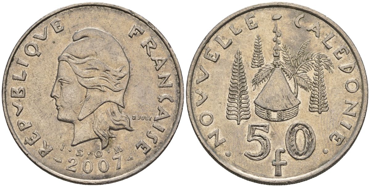 Французская Новая Каледония 50 франков 2007 хижина среди сосен и пальм, (IEOM) KM 13a, Schoen 15a, Lec 128i медно-никель 4144-832