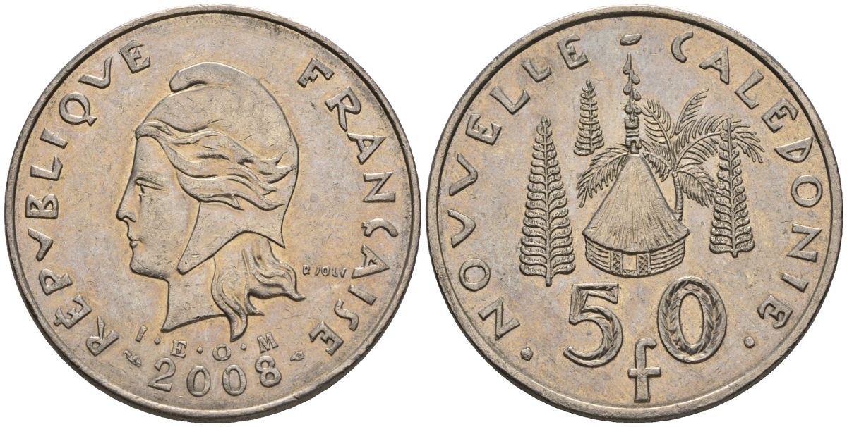 Французская Новая Каледония 50 франков 2008 хижина среди сосен и пальм, (IEOM) KM 13a, Schoen 15a, Lec 128i медно-никель 4111-443