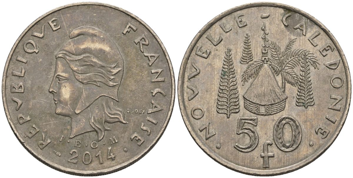 Французская Новая Каледония 50 франков 2014 хижина среди сосен и пальм, (IEOM) KM 13a, Schoen 15a, Lec 128i медно-никель 4111-1112