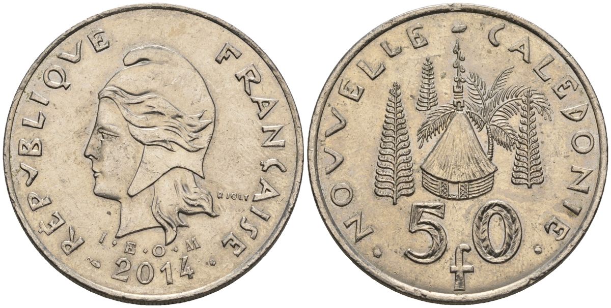 Французская Новая Каледония 50 франков 2014 хижина среди сосен и пальм, (IEOM) KM 13a, Schoen 15a, Lec 128i медно-никель 4111-1132