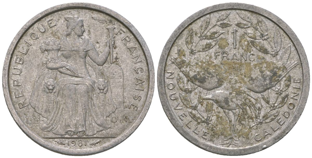 Французская Новая Каледония 1 франк 1981 птица кагу, (IEOM) KM 10, Schoen 10, Lec 44 алюминий 51-1124