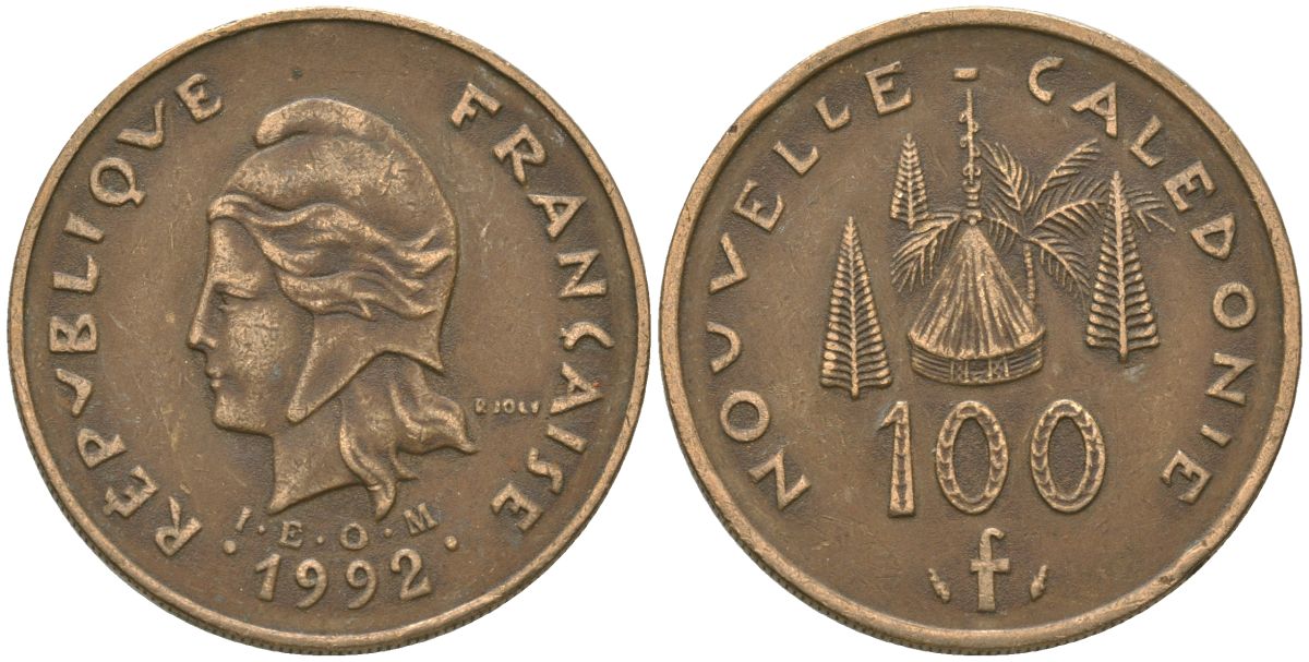 Французская Новая Каледония 100 франков 1992 хижина среди сосен и пальм, (IEOM) KM 15, Schoen 16, Lec 137 никель бронза 88-912