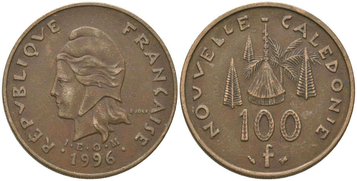 Французская Новая Каледония 100 франков 1996 хижина среди сосен и пальм, (IEOM) KM 15, Schoen 16, Lec 139 никель бронза 88-1142