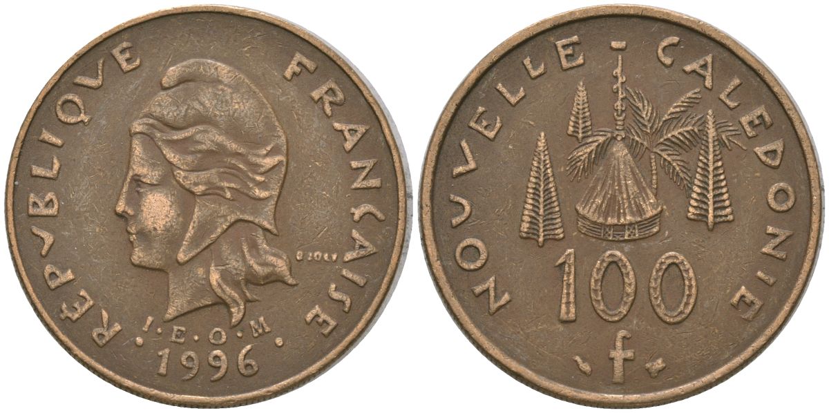 Французская Новая Каледония 100 франков 1996 хижина среди сосен и пальм, (IEOM) KM 15, Schoen 16, Lec 139 никель латунь 4140-1025