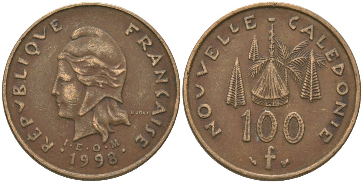 Французская Новая Каледония 100 франков 1998 хижина среди сосен и пальм, (IEOM) KM 15, Schoen 16, Lec 139b никель бронза 4680-1025
