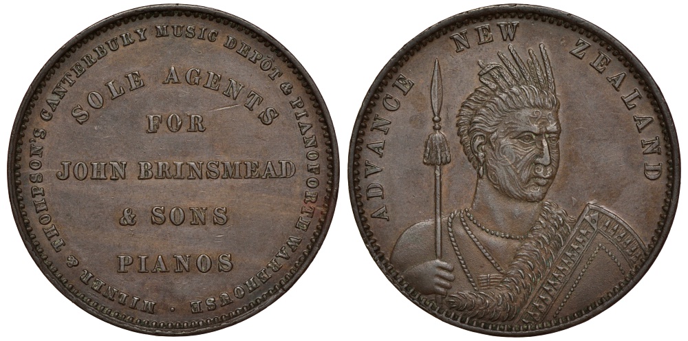 Новая Зеландия 1 пенс 1857-1881 абориген с копьем, Мильнер и Томпсон KM Tn 53 бронза aUNC 00-808-69