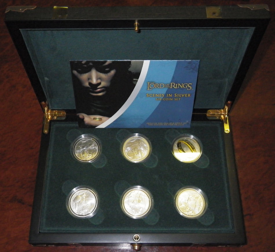 Новая Зеландия набор из 6 монет по 1 доллару 2003 серия властелин колец, монета с великим кольцом, коробка, сертификат КМ 141a, КМ 247, КМ 248, КМ 249, КМ 250, КМ 251, КМ 253 серебро UNC 14-01-04-04