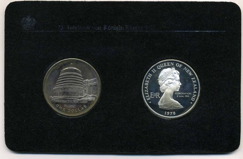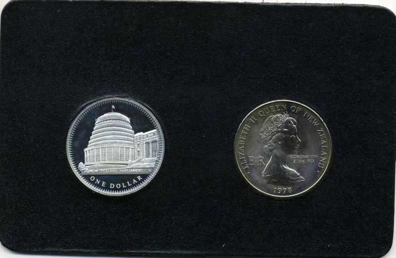 ----Новая Зеландия набор из двух монет по 1 доллару 1978 25 лет коронации Елизаветы II и открытие здания Парламента, в буклете KM 47, 47a серебро, медно-никель PROOF, UNC 7-4-54