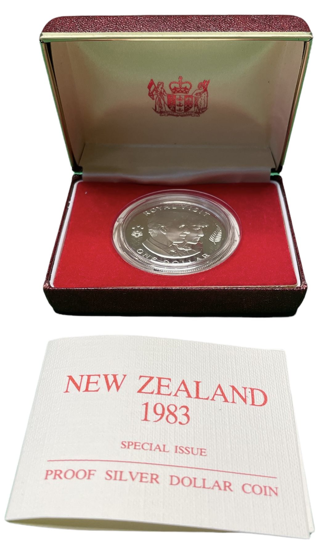 Новая Зеландия 1 доллар 1983 королевский визит, принц Чарльз и леди Диана, Елизавета II (1952-2022), в оригинальной коробке, сертификат KM 52а серебро PROOF 3-4-7-20