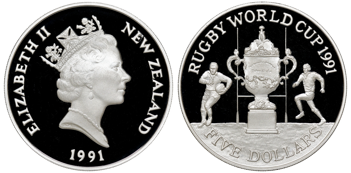 Новая Зеландия 5 долларов 1991 чемпионат по регби среди стран Содружества, с сертификатом KM 80а серебро PROOF 4-3-3-31