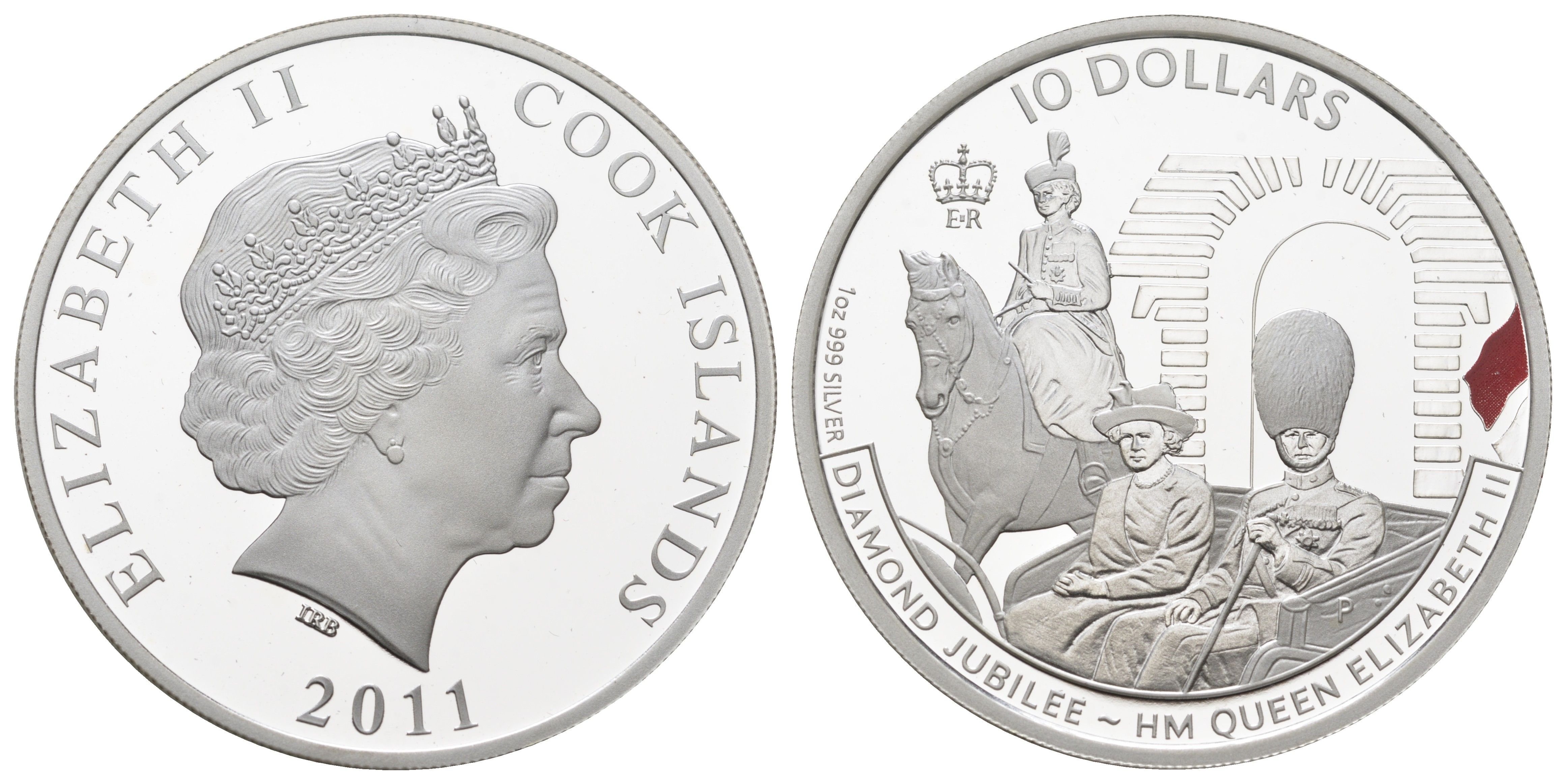 Острова Кука 10 долларов 2011 60 лет вступлению на престол Королевы Елизаветы II, Елизавета II (1952-2022) KM 1583 серебро PROOF 11-057-22