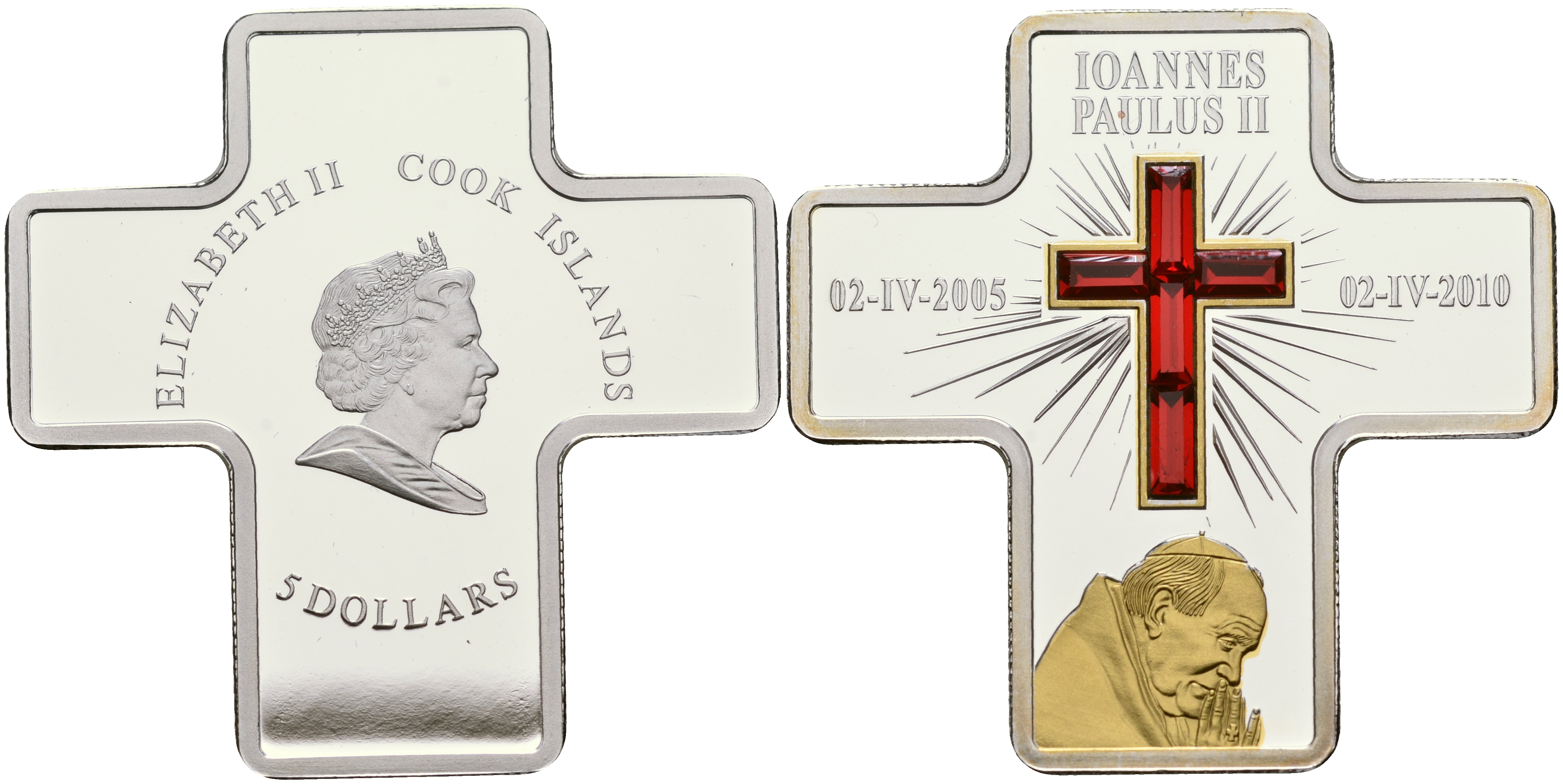 Острова Кука 5 долларов 2010 Иоанн Павел II, молитва, 5 лет со дня смерти, камни, позолота серебро PROOF 1097-4-23