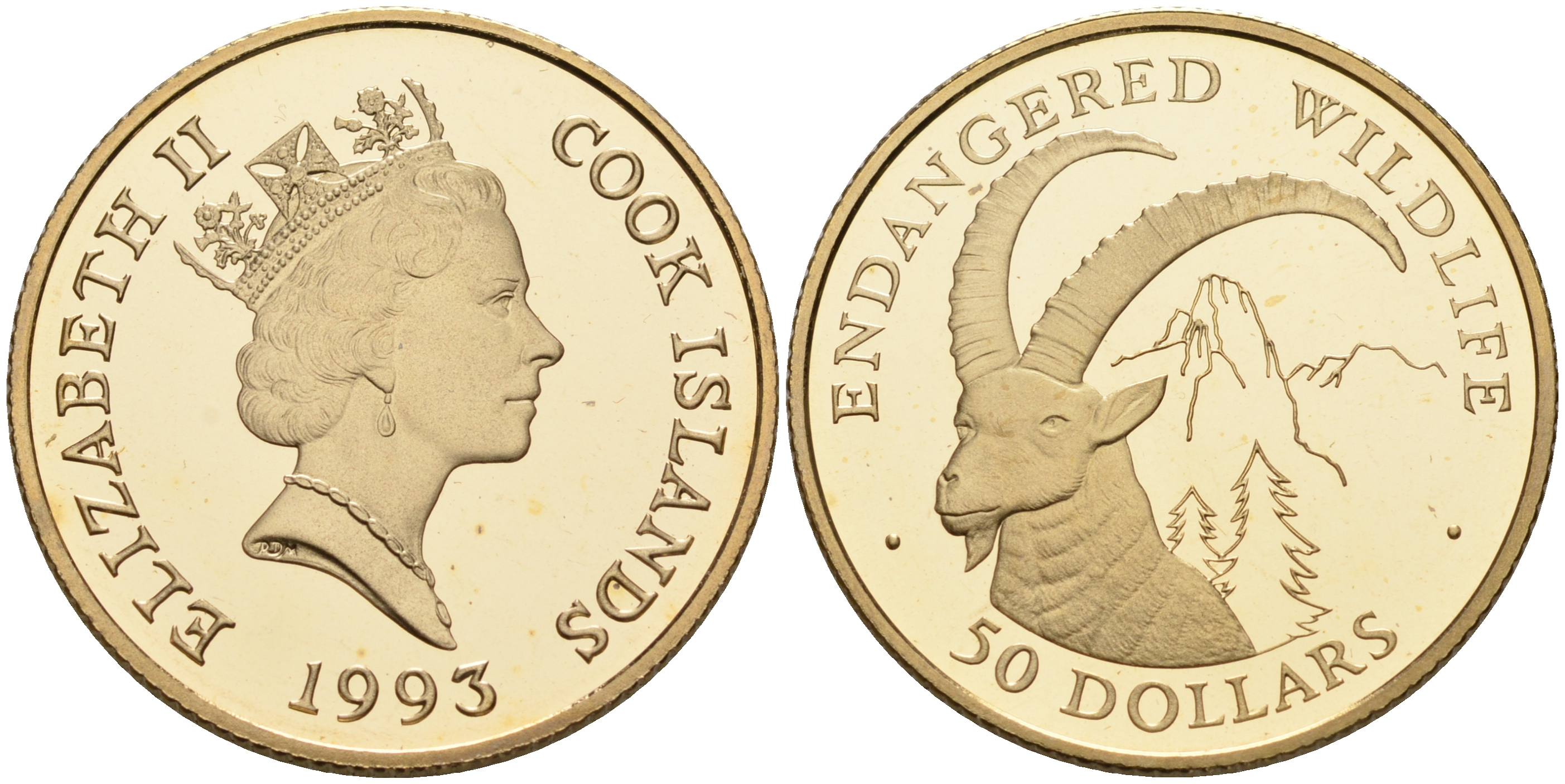 Острова Кука 50 долларов 1993 серия сохраним наш мир, альпийский горный козёл KM 153 золото PROOF 00-809-80