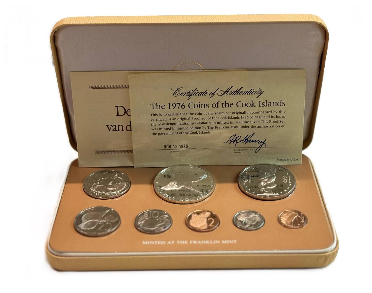 Острова Кука набор из 8 монет (1, 2, 5, 10, 20 и 50 центов; 1 и 5 долларов) 1976 Птицы - Мангаианский зимородок, в оригинальной упаковке, с сертификатом подлинности KM 1, 2, 3, 4, 5, 6, 7 и 15 PROOF 4-3-1-16