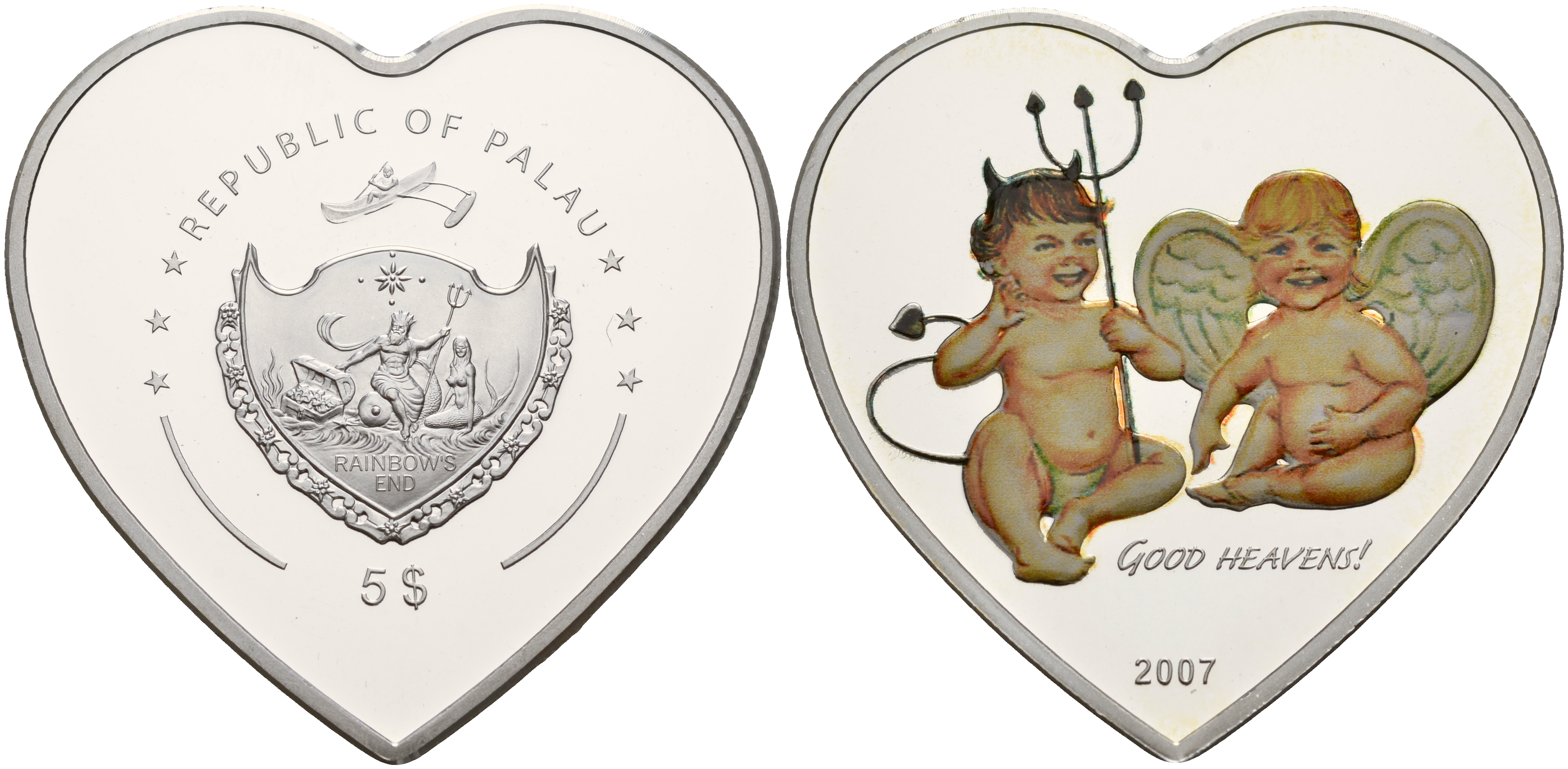 Палау 5 долларов 2007 Ангелочки, монета в форме сердца (монета влюбленных), тираж 2500 экз, сертификат, коробочка серебро PROOF 7-4-2-18