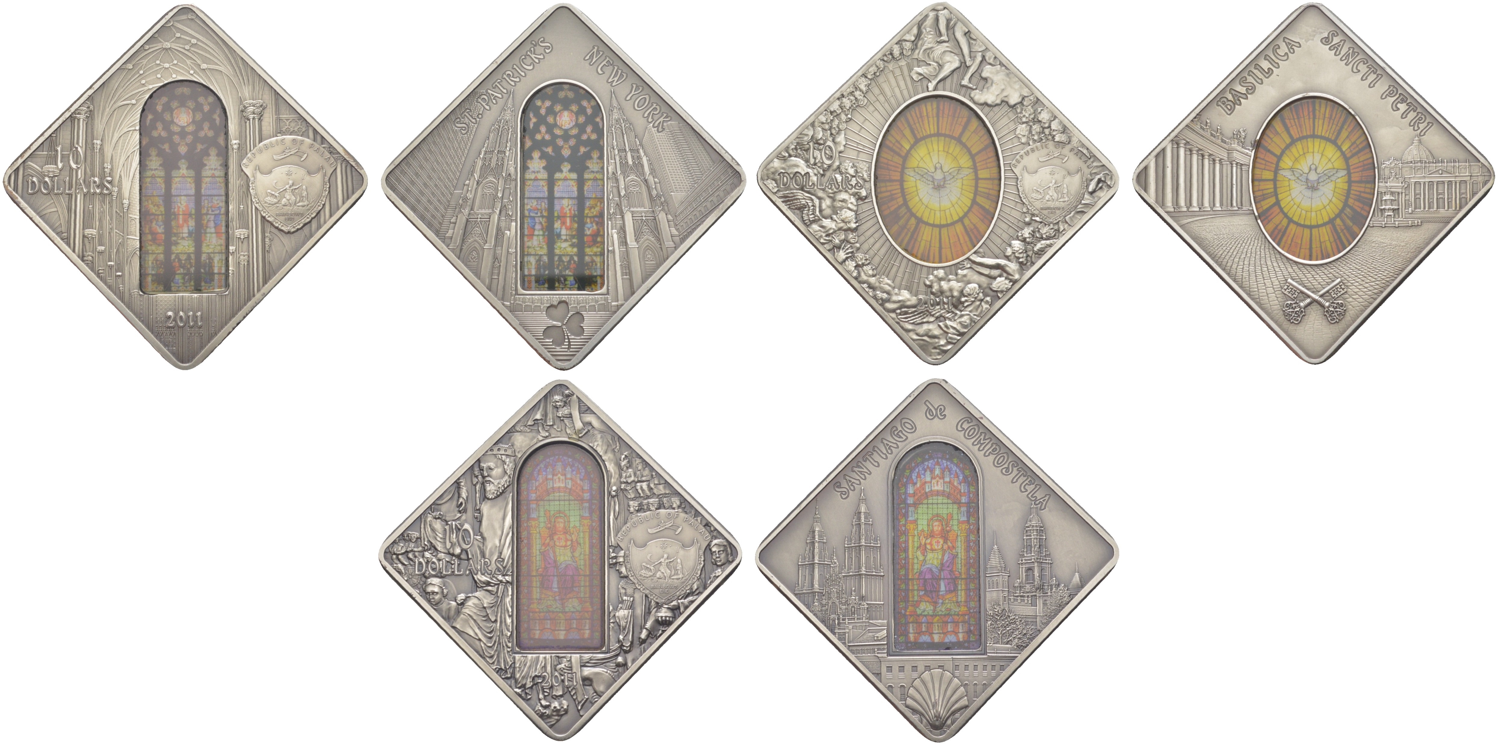 Палау набор из 3 монет (10 долларов) 2011 Священное искусство - Собор Святого Патрика, Нью-Йорк, Сантьяго-де-Компостела, Базилика Святого Петра, в оригинальной коробке, с сертификатом, тираж 999 экземпляров KM 411, 412, 413 серебро PROOF 8-2-02-01