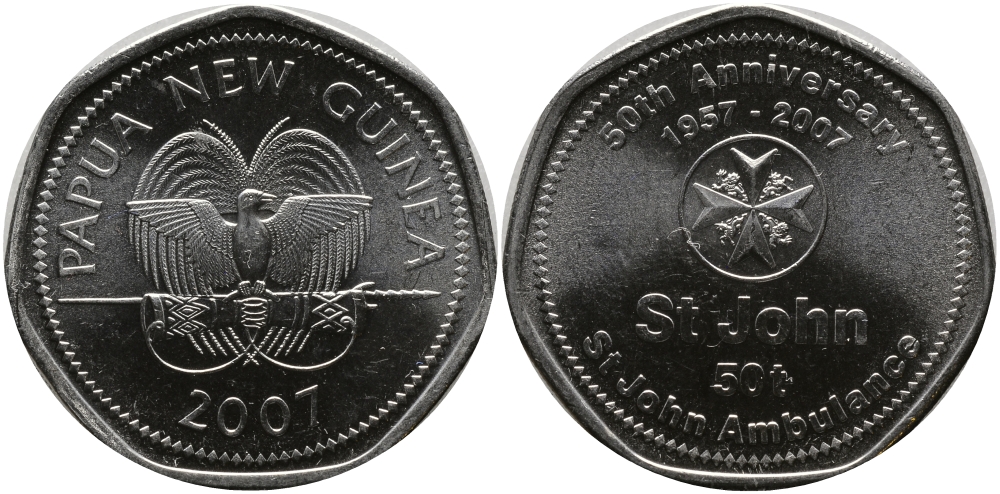 Папуа-Новая Гвинея 50 тойя 2007 50 лет скорой помощи Святого Иоанна KM 53 никелированная сталь UNC M46-02