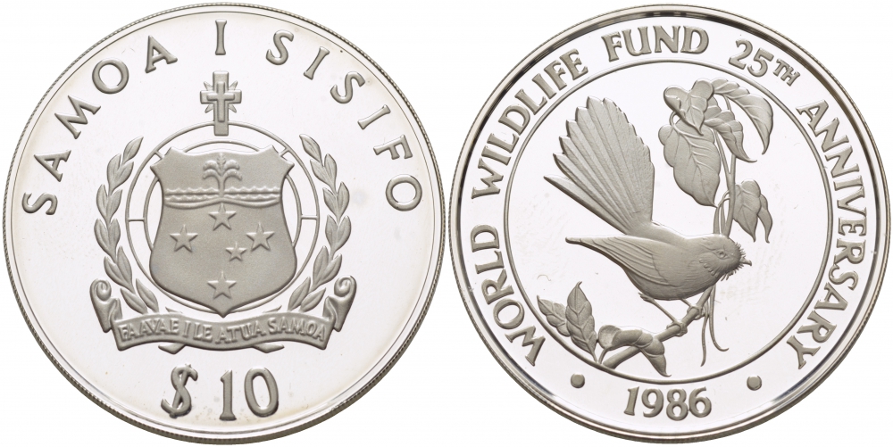 Самоа 10 тала 1986 25 лет WWF, самоанский куриный голубь KM 72 серебро PROOF 1068-5-62