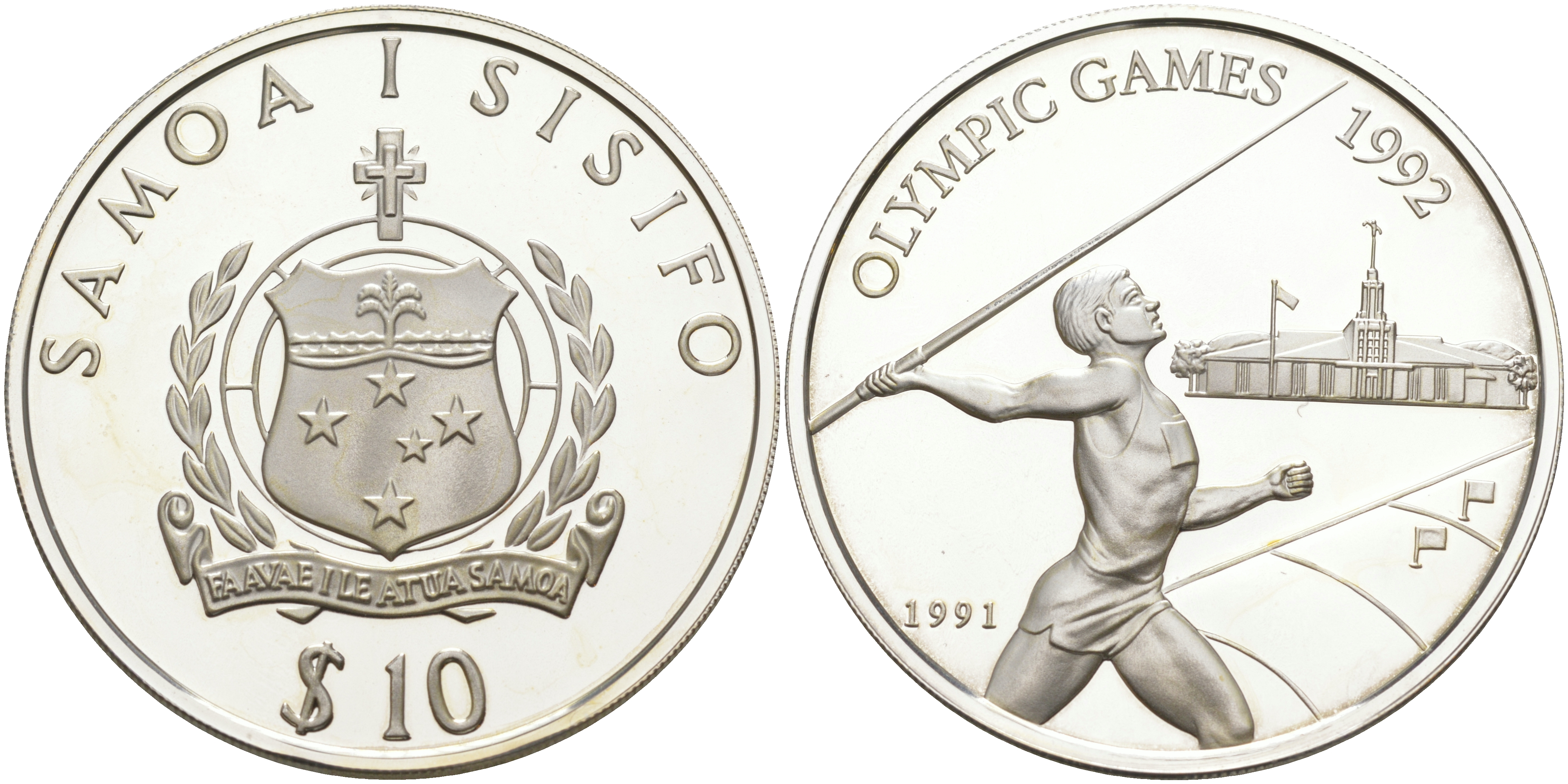 Самоа 10 тала 1991 XXV Олимпийские игры в Барселоне 1992 года, метание копья KM 85 серебро PROOF 1074-5-51