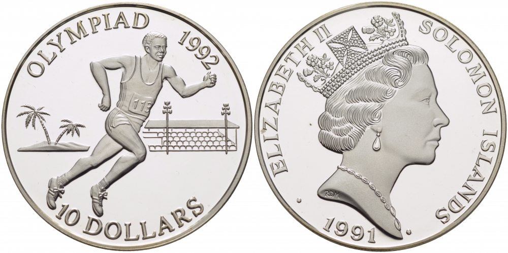 Соломоновы острова 10 долларов 1991 XXV Олимпийские игры 1992 года в Барселоне, бег KM 48 серебро PROOF 04-101-15