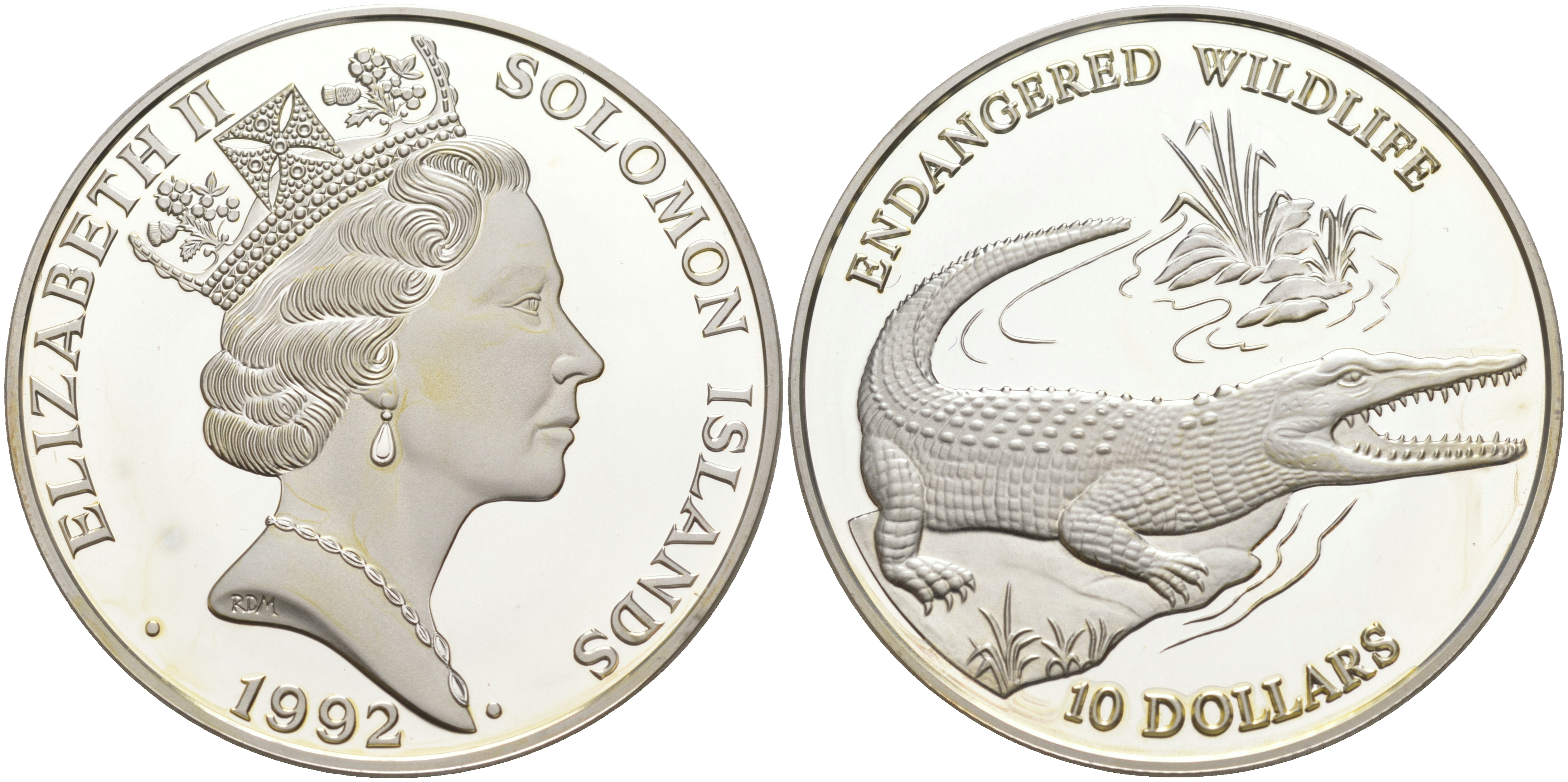 Соломоновы острова 10 долларов 1992 серия исчезающие виды животных, морской, гребнистый крокодил KM 51 серебро PROOF 1078-7-23