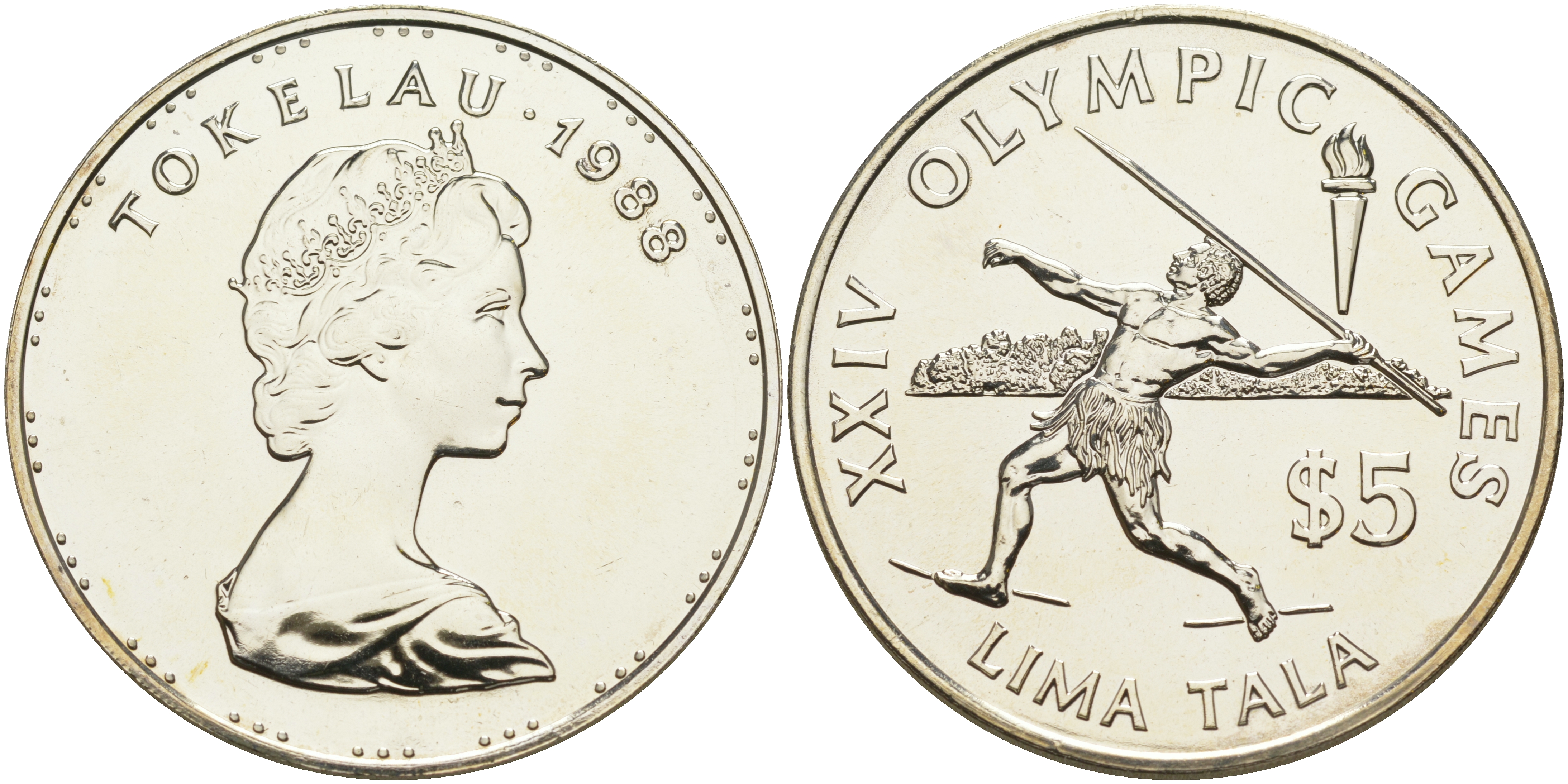 Токелау 5 тала 1988 XXXIVI Олимпийские игры 1988 года в Сеуле, копьеметатель KM 10 серебро UNC 02-115-44