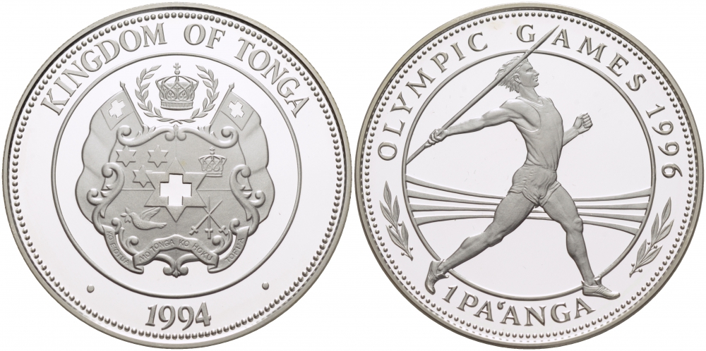 Тонга 1 паанга 1994 XXVI Олимпийские игры 1996 года в Атланте, копьеметатель KM 159 серебро PROOF 04-101-33