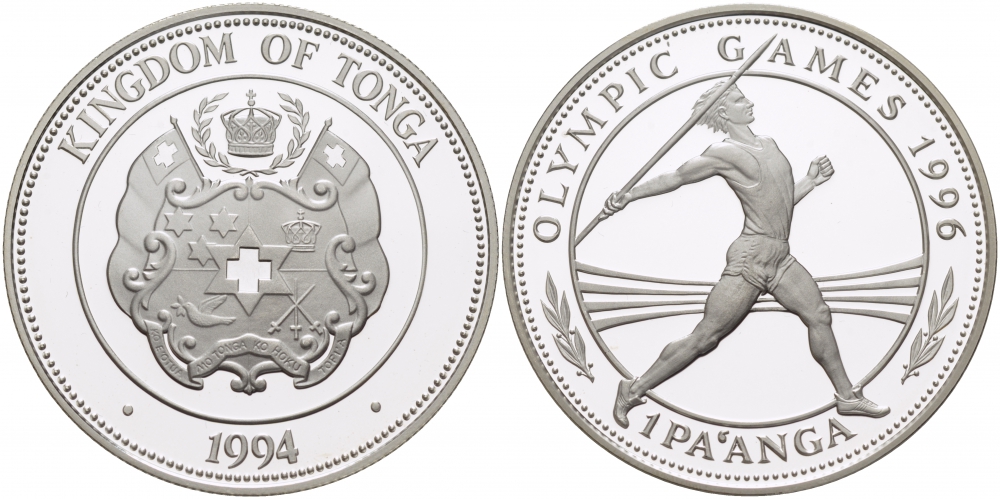 Тонга 1 паанга 1994 XXVI Олимпийские игры 1996 года в Атланте, копьеметатель KM 159 серебро PROOF 04-313-25
