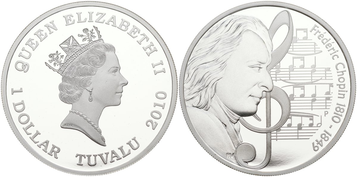Тувалу 1 доллар 2010 Фредерик Шопен, 200 лет со дня рождения, тираж 5000 экз. серебро PROOF 02-073-22
