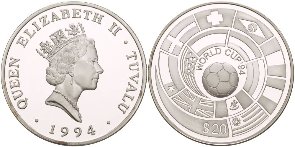 Тувалу 20 долларов 1994 чемпионат мира по футболу 1994 года В США, флаги стран в спирали KM 22 серебро PROOF 1081-8-53