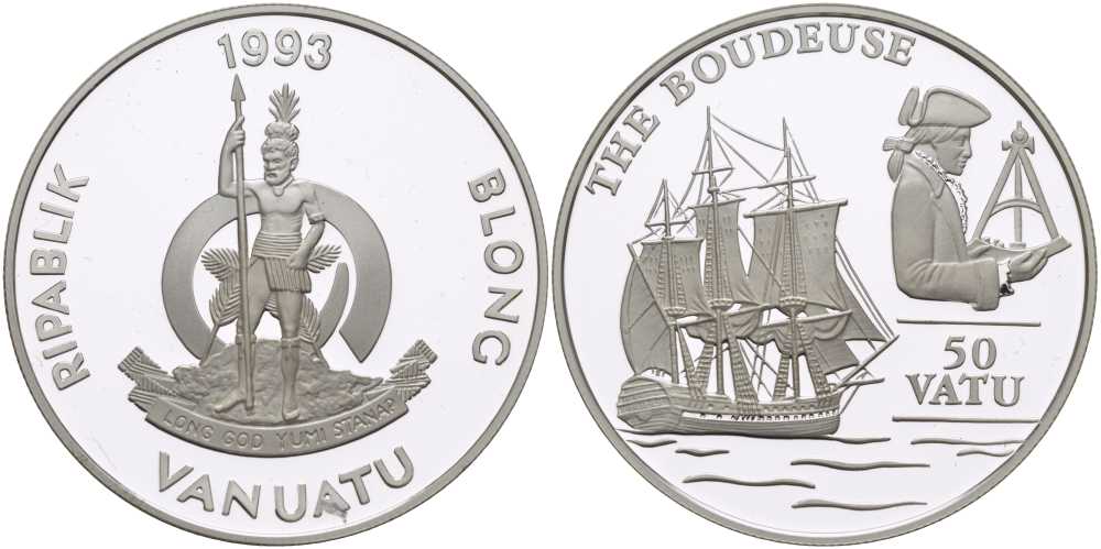 Вануату 50 вату 1993 история мореплавания, фрекат Будьюз KM 16 серебро PROOF 1078-1-51