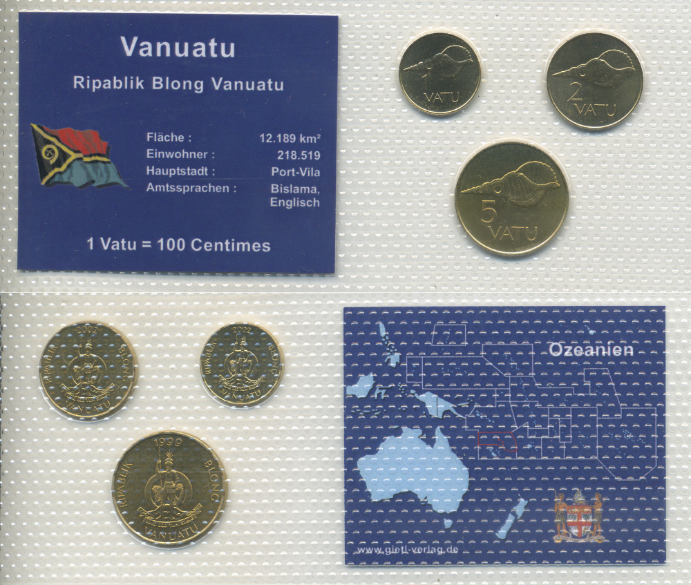Вануату набор из 3 монет 1999-2002 1, 2, 5 вату, в запайке UNC 1-5-2-43