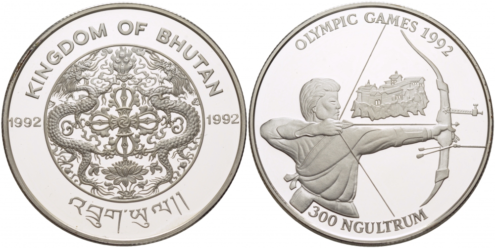 ----Бутан 300 нгултрумов 1992 XXV Олимпийские игры в Барселоне 1992 года, стрельба из лука KM 76 серебро PROOF 04-102-44