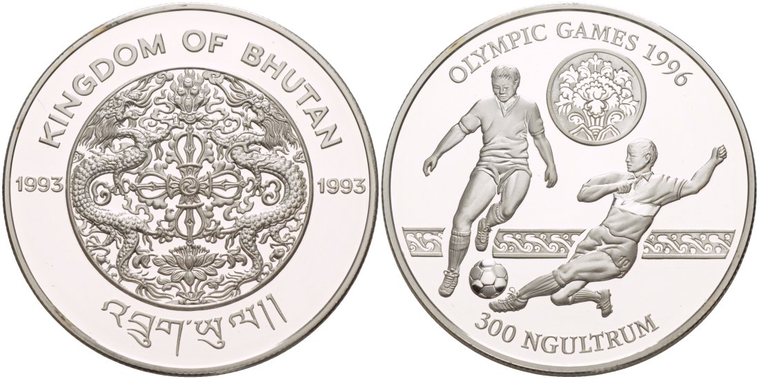Бутан 300 нгултрумов 1993 Олимпийские игры 1996 года в Атланте, футбол KM 79 серебро PROOF 1081-8-42