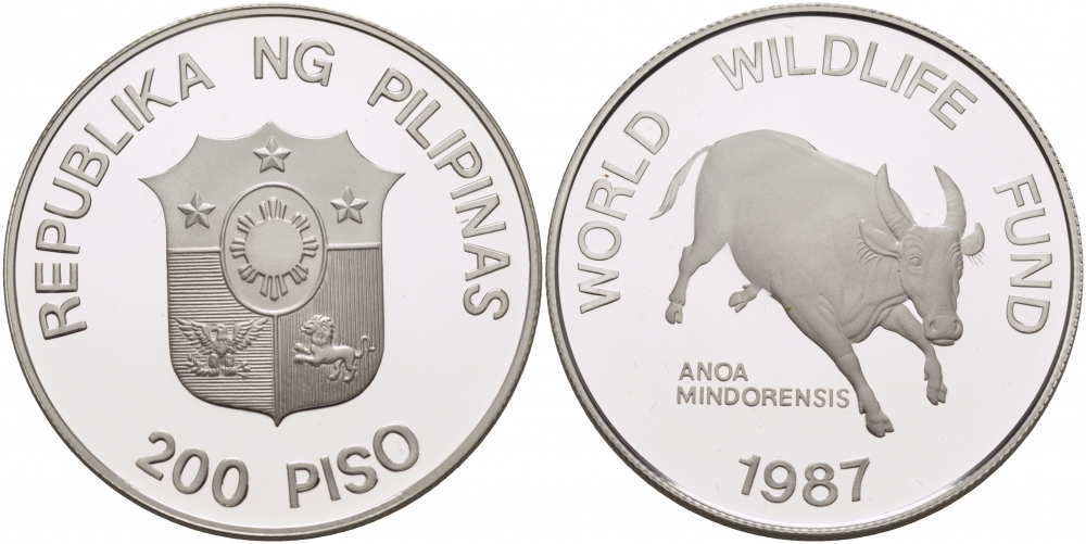 Филиппины 200 писо 1987 серия 25 лет окружающей среды, буйвол тамарау KM 248 серебро PROOF 01-146-21