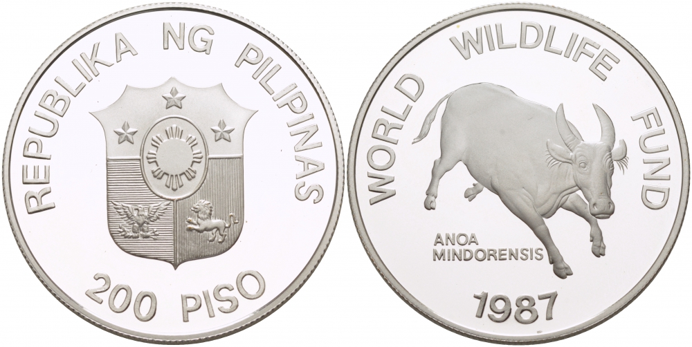 Филиппины 200 писо 1987 серия 25 лет окружающей среды, буйвол тамарау KM 248 серебро PROOF 02-056-43