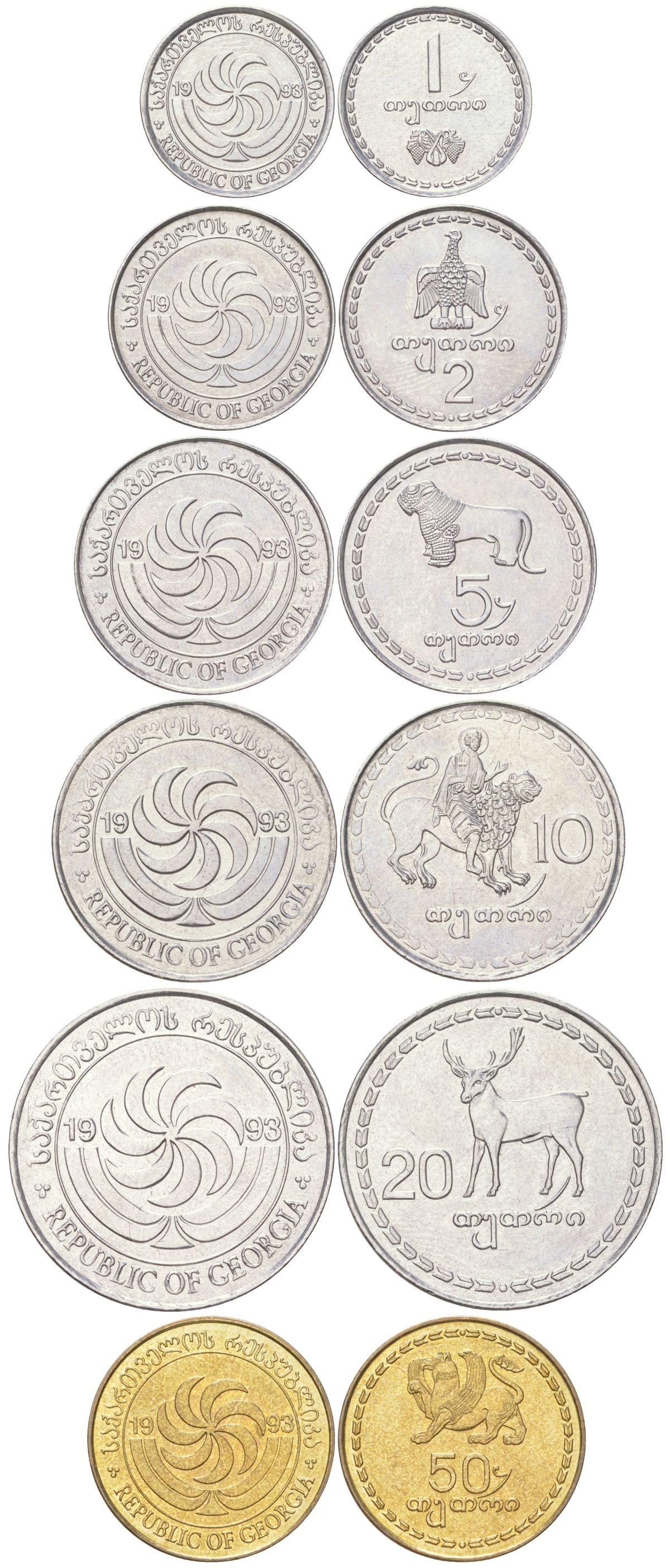 Грузия годовой набор из 6 монет (1, 2, 5, 10, 20 И 50 тетри) 1993 KM 76, 77, 78, 79, 80 и 81 никель сталь и латунь UNC 4612-931-933