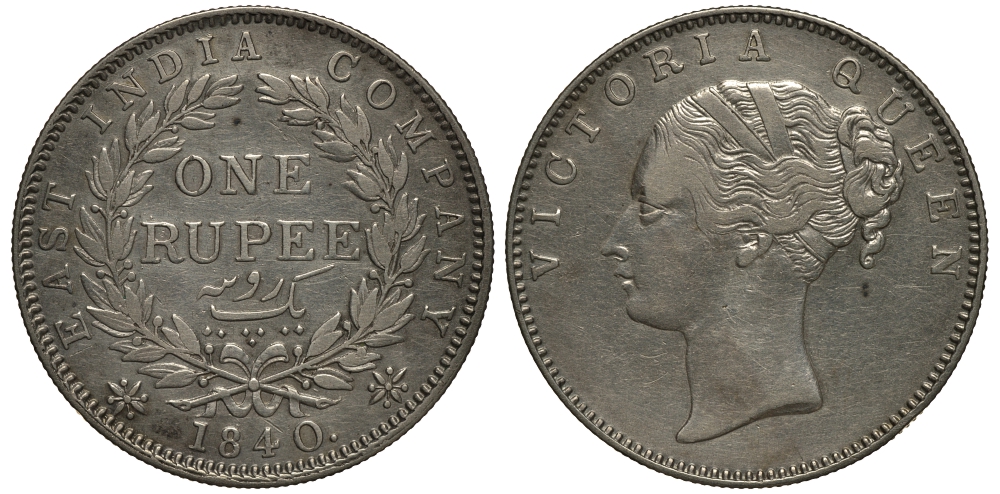 Британская Индия 1 рупия 1840 Виктория (1837-1901), Британская Ост-Индская компания, 19 ягод в венке KM 457.1 серебро 633-1122