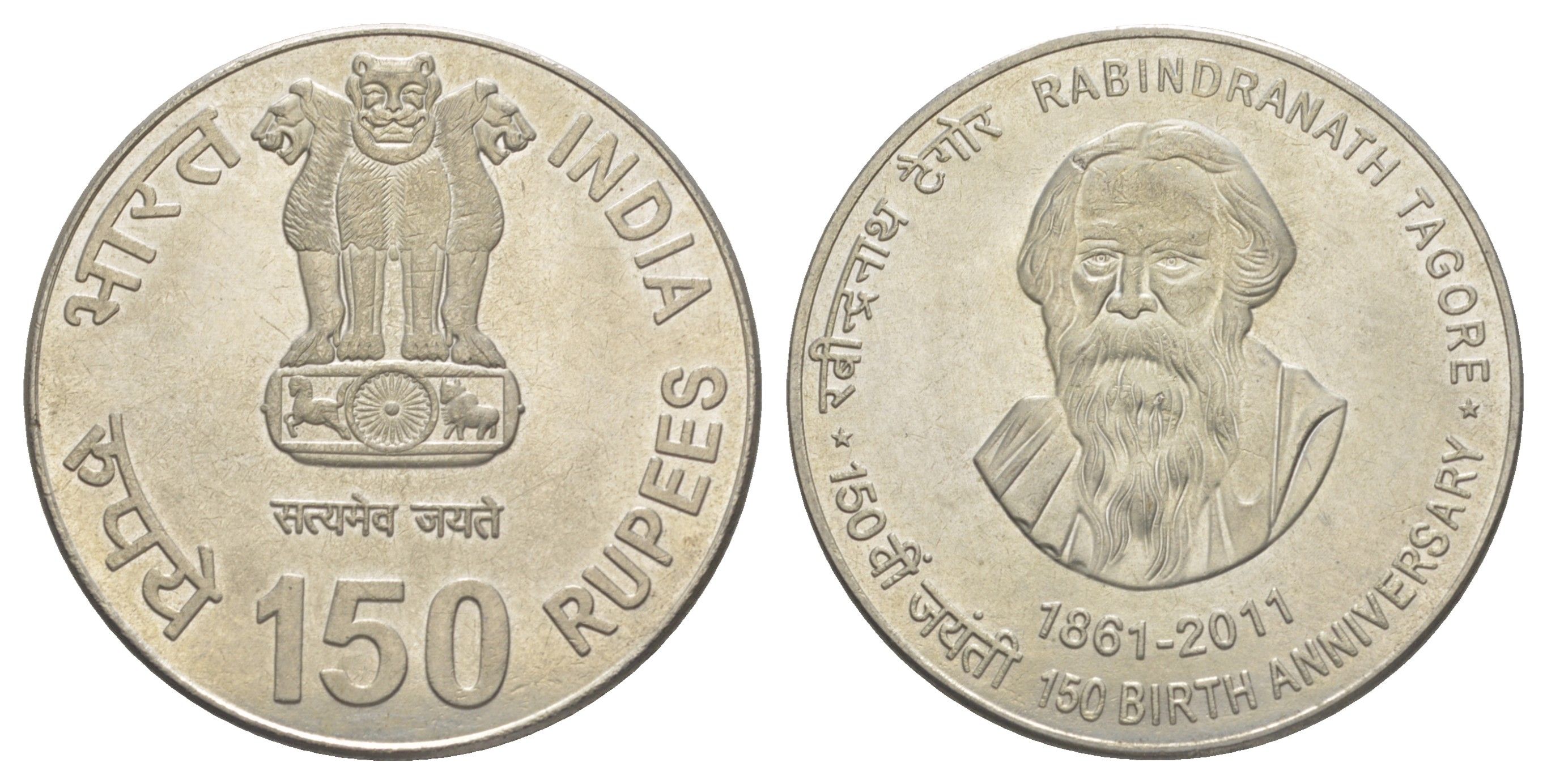 ----Индия 150 рупий 2011 150 лет со дня рождения Рабиндраната Тагора KM 416 серебро BU 1088-6-32