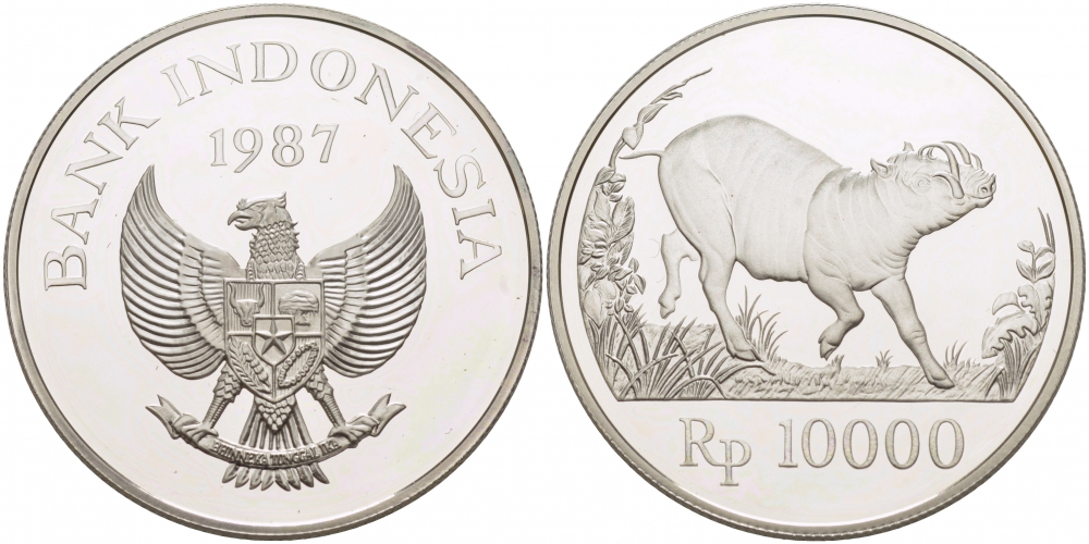 ИНДОНЕЗИЯ 10000 РУПИЙ 1987 СЕРИЯ 25 ЛЕТ ЗАЩИТЕ ОКРУЖАЮЩЕЙ СРЕДЫ, БОРОДАВОЧНИК KM 45 серебро PROOF 1068-6-13