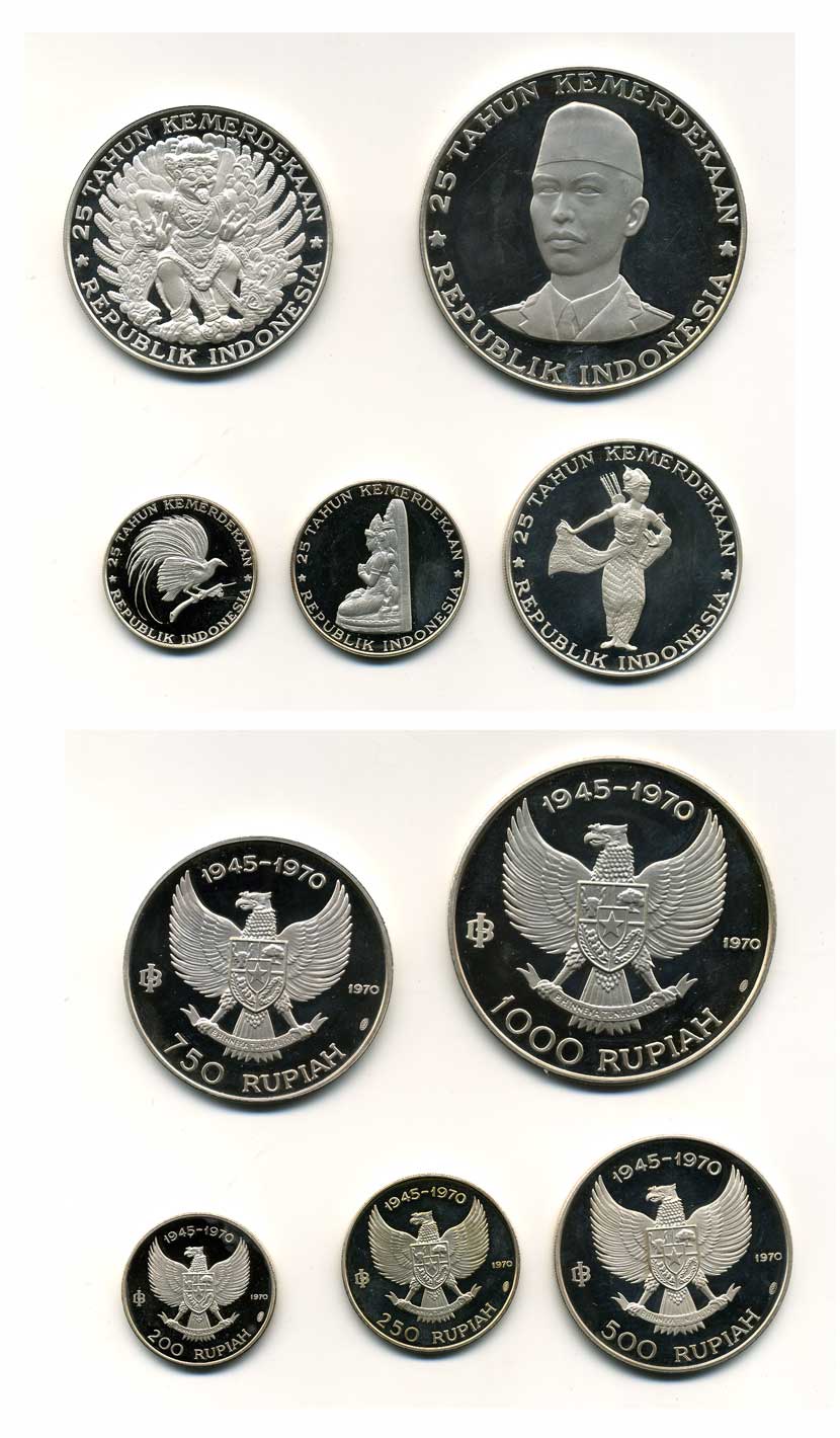 ИНДОНЕЗИЯ НАБОР ИЗ 5 МОНЕТ 1970 25 ЛЕТ НЕЗАВИСИМОСТИ KM 23, 24, 25, 26, 27 серебро Ш5