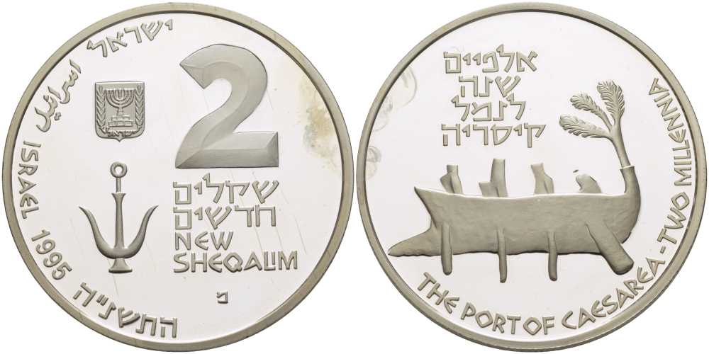 ИЗРАИЛЬ 2 ШЕКЕЛЯ НОВЫХ 1995 ПОРТ В КЕСАРИИ, АНТИЧНЫЙ КОРАБЛЬ, ТИРАЖ 2560 ЭКЗ., ПРОБА 925, ВЕС 28,8 ГР., ДИАМЕТР 38,5 ММ., ГУРТ РУБЧАТЫЙ KM 288 серебро PROOF 1080-10-23