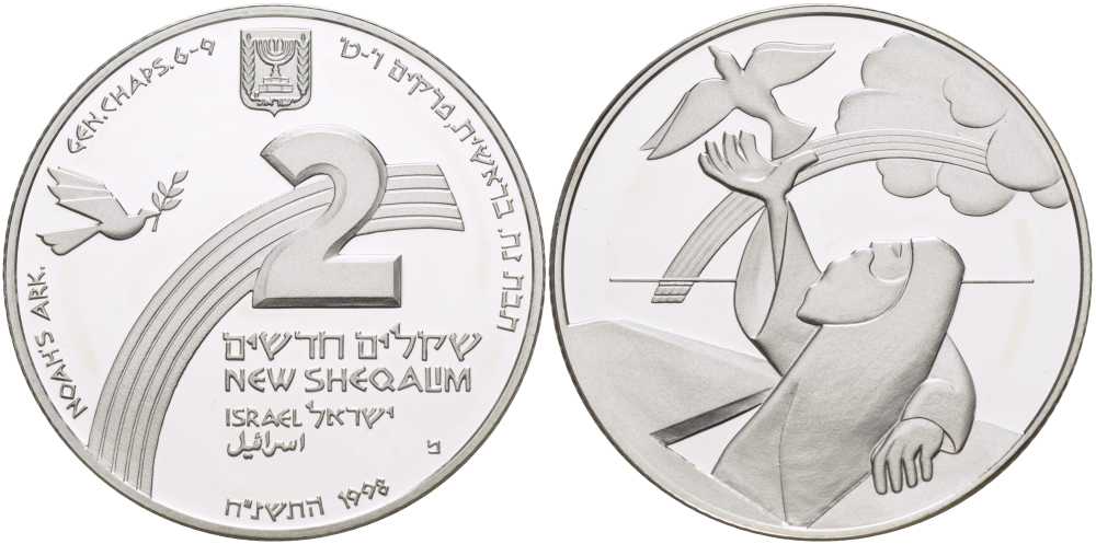 Израиль 2 шекеля новых 1998 Библейский Ноев ковчег, Ной выпускает голубя, тираж 2164 экземпляров KM 317 серебро PROOF 00-000-00