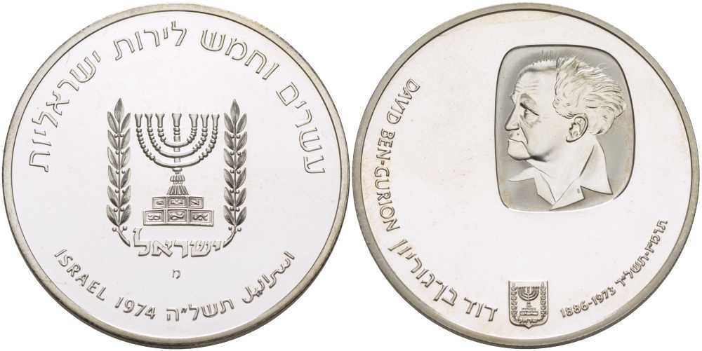 Израиль 25 лир 1974 годовщина со дня смерти Давида Бен-Гуриона KM 79.2 серебро PROOF 1080-3-24