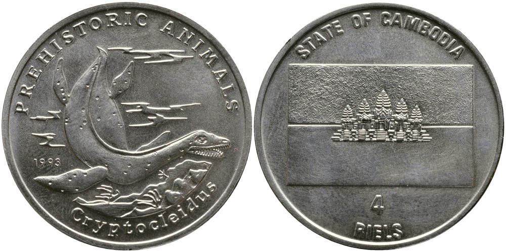 Камбоджа 4 риеля 1993 серия доисторические животные, динозавры криптоклиды (CRYPTOCLEIDUS) KM 86 медно-никель UNC 00-00