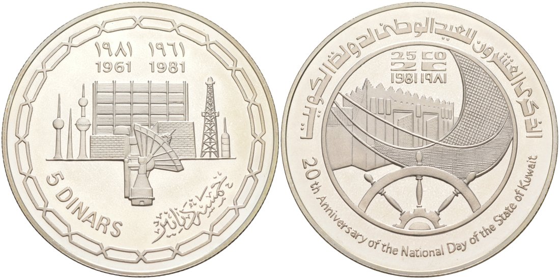 ----Кувейт 5 динаров 1981 20 лет независимости (1961-1981), в оригинальной коробке KM 18 серебро PROOF 00-00