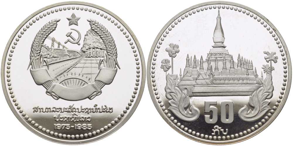 Лаос 50 кипов 1985 10 лет образованию Народно-Демократической Республики, Тхат Луанг KM 26 серебро PROOF 1078-8-21