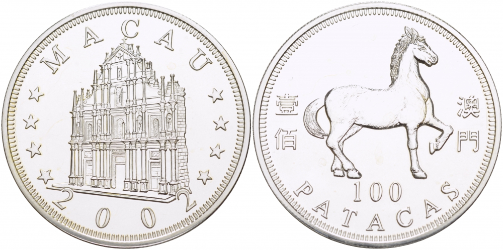 Макао 100 патака 2002 лунный календарь, год лошади KM 107 серебро UNC 1085-9-22