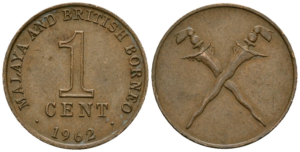 Малайя и Британское Борнео 1 цент 1962 Скрещенные мечи, британские колония KM 6 бронза 4136-826
