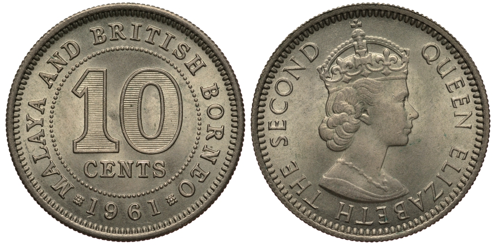 МАЛАЙЯ И БРИТАНСКОЕ БОРНЕО 10 ЦЕНТОВ 1961 ЕЛИЗАВЕТА II KM 2 медно-никель UNC 4392-1142